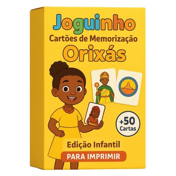 Aprendizado rápido e visual para ajudar seu filho a reconhecer cada Orixá pelas cores, símbolos e elementos. Perfeitos para revisar, brincar, montar jogos e reforçar a memória de forma divertida.