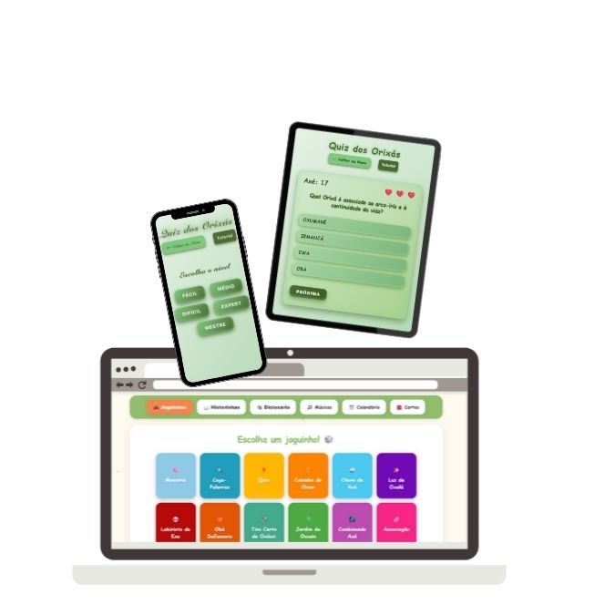 Um quiz interativo com perguntas fáceis, médias e difíceis para toda a família. Ajuda a fixar o conhecimento sobre símbolos, cores e domínios dos Orixás, tornando o aprendizado leve e divertido.