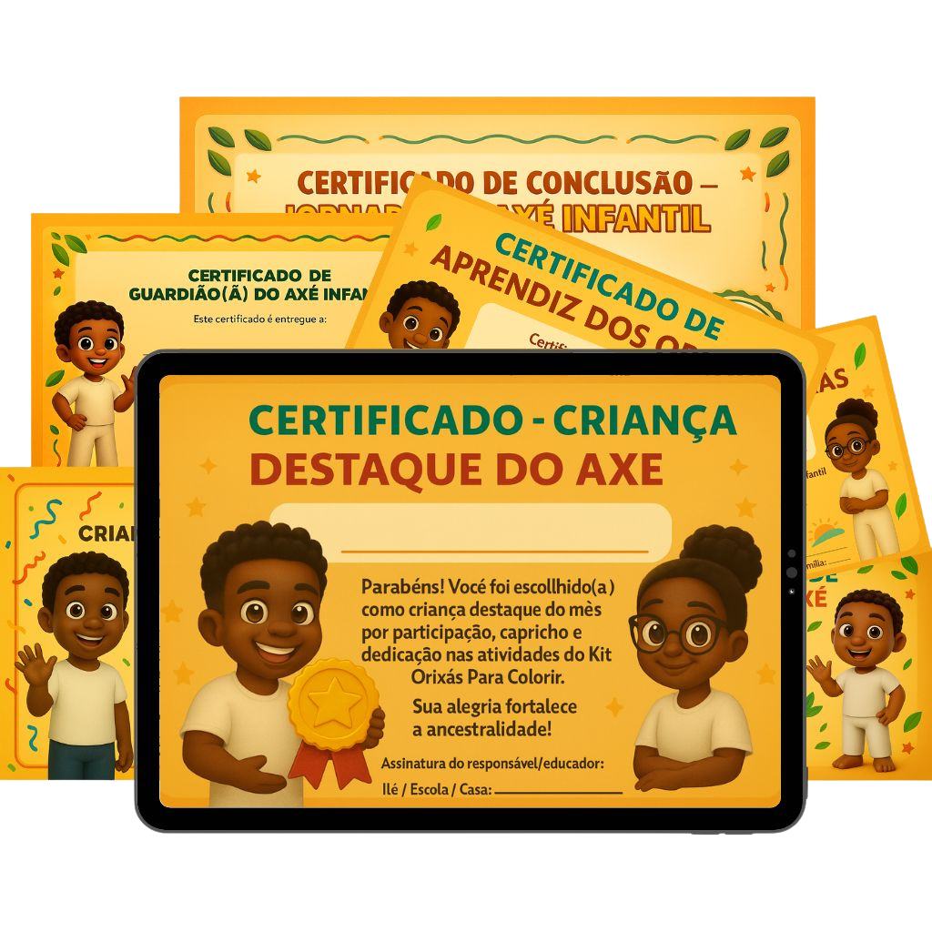 Certificados de Candomblé Infantil prontos para imprimir, ideais para celebrar cada etapa do aprendizado da criança no axé. Bonitos, representativos e fáceis de personalizar com o nome da criança.